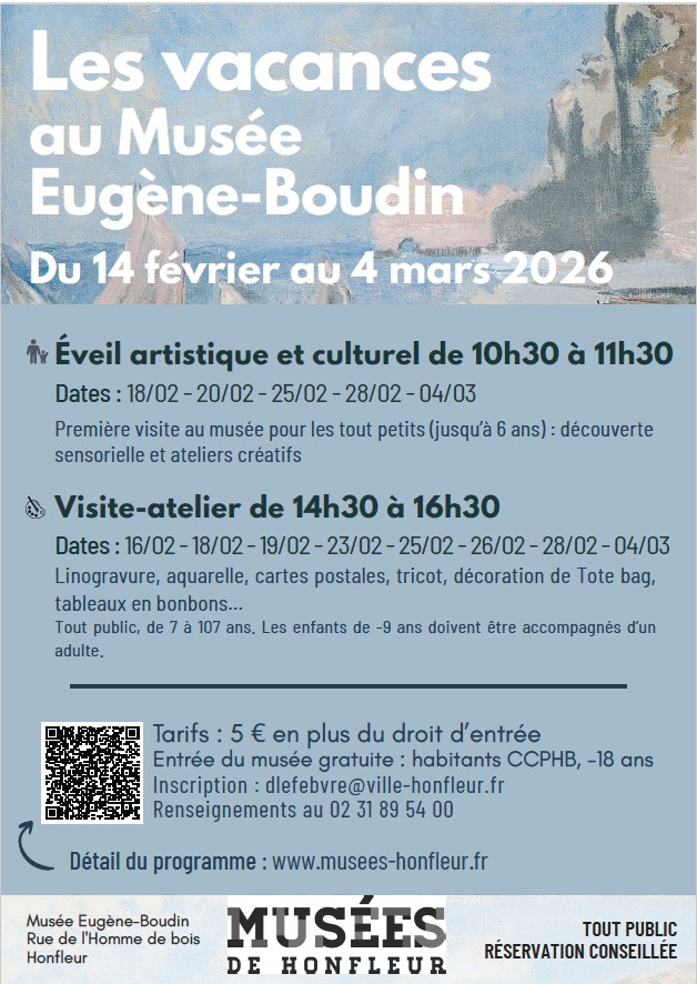 Les vacances scolaires au musée Eugène-Boudin Vendredi 20 février : * 10h30-11h30 : éveil artistique et culturel (jusqu'à 6 ans) -