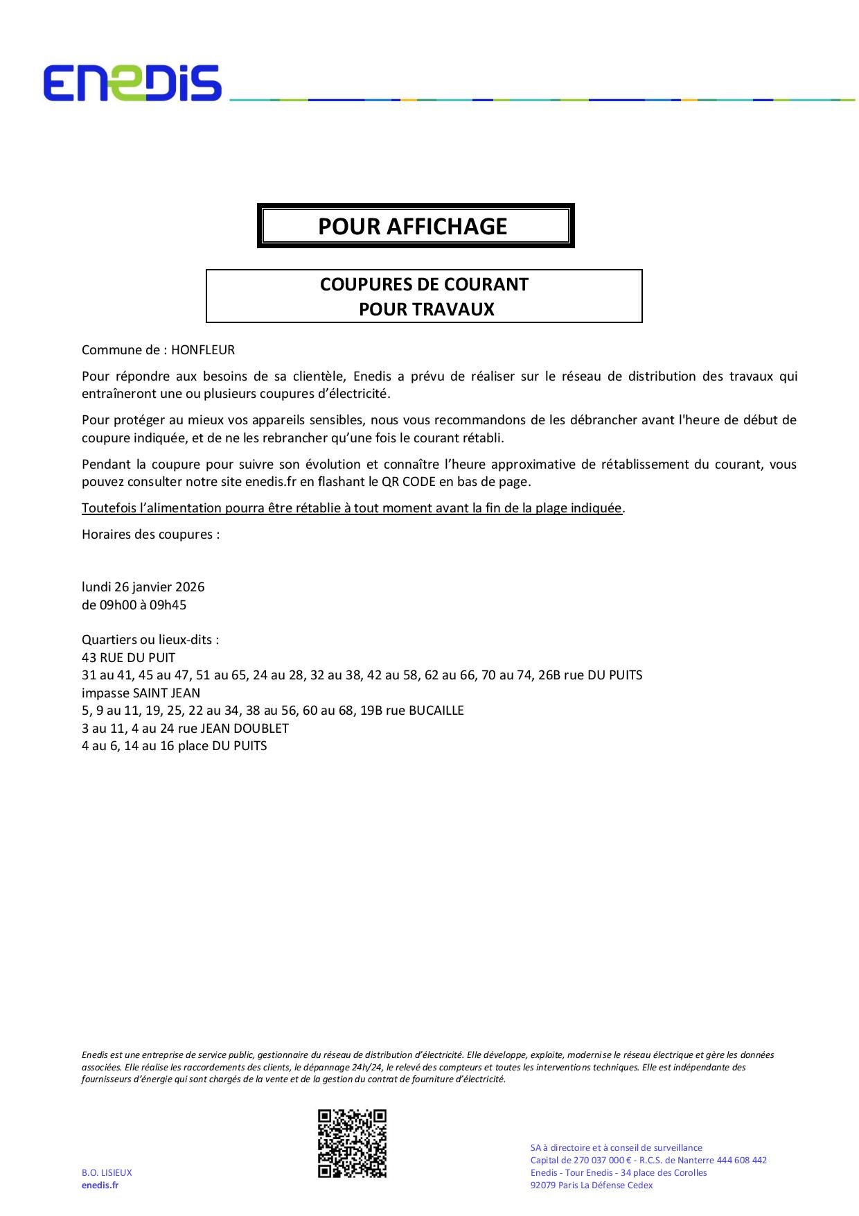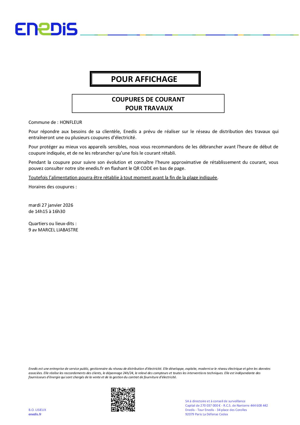 Vous êtes ici : Accueil » La Municipalité » Votre Mairie » Actualités » ENEDIS COUPURES DE COURANT – JANVIER 2026